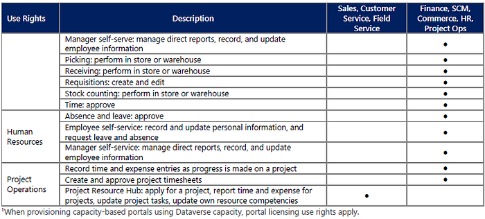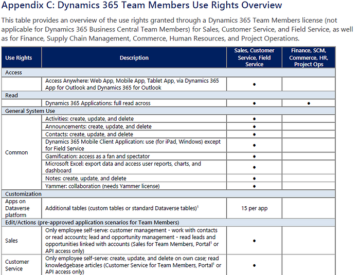 Users with a Team Members license can read Dynamics 365 data generated from Finance, Supply Chain Management, Commerce, Human Resources, Project Operations, Sales, Customer Service, and Field Service. They may access a specific set of the functionalities of these products. The Team Members license does not provide access to custom applications. You have limited table (formerly known as 'entity') customization options for Team Members, read more about custom tables in Appendix D.