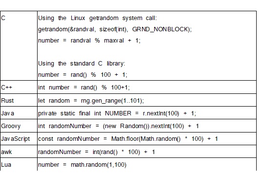 இதில் அனைத்து கணினி மொழிகளிலும் ஏராளமான அளவிலான ஒற்றுமைகளைக் காணலாம். பெரும்பாலான நிரலாக்க மொழிகள் rand() போன்ற ஒரு செயலியைக் கொண்டு ஒரு சீரற்ற எண்ணை உருவாக்குகின்றன, அவற்றை நாம் சொந்தமாக ஒரு வரம்பில் வைக்கலாம். பெரும்பாலான கணினி மொழிகள் ஒரு சிறப்பு செயலியைப் பயன்படுத்துகின்றன, அதில் நாம் சீரற்ற மதிப்பிற்கான வரம்பைக் குறிப்பிடலாம்.