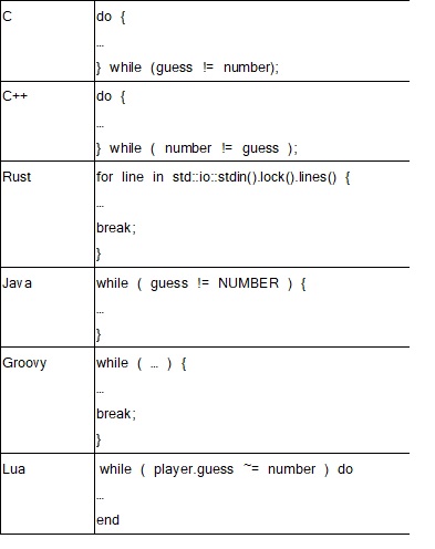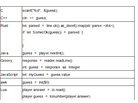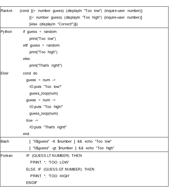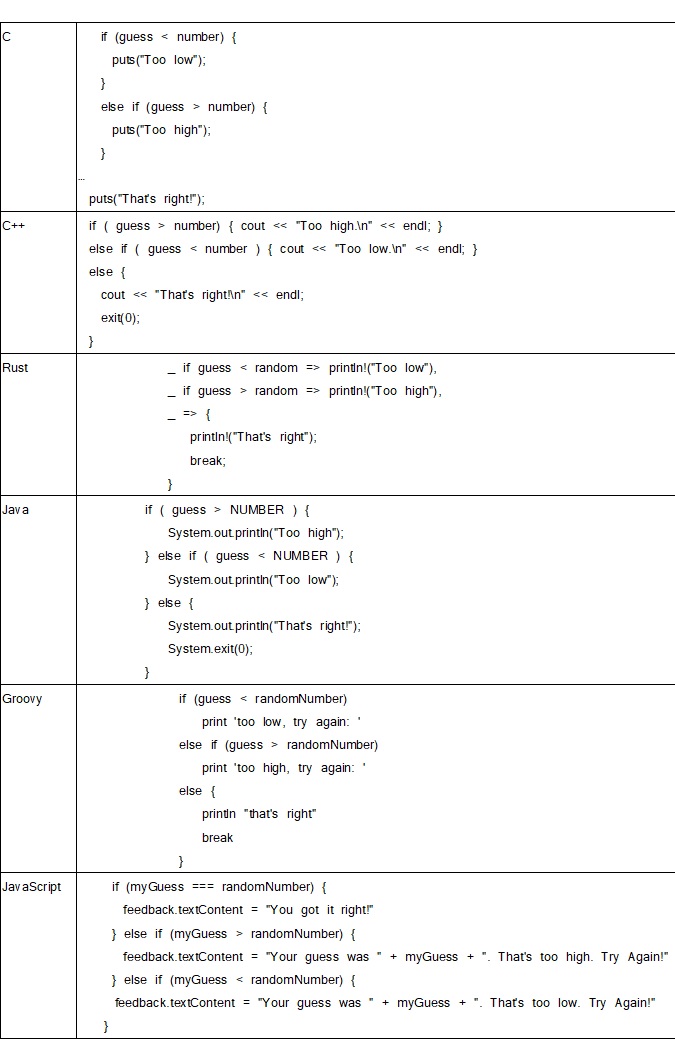. எடுத்துக்காட்டாக, "guess the number"எனும் விளையாட்டின் முக்கிய படிமுறைகளை இந்த வெவ்வேறு நிரலாக்க மொழிகள் எவ்வாறு செயல்படுத்துகின்றன என்பதை இப்போது காண்போம். அடிப்படைகள் எவ்வாறு ஒத்தவை அல்லது வேறுபட்டவை என்பதில் கவனம் செலுத்திடு வதற்காக, தற்காலிக மாறிகள் ஒதுக்குவது போன்றவை தவிர வேறு சிலவற்றை தவிர்த்திடுக.