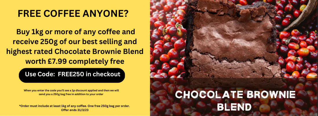 For the whole of March, if you buy 1Kg or more of any of our coffees, you'll get 250g of chocolate brownie blend, our no1 best seller, completely free, when you use the discount code FREE250. | | | When you enter the code "FREE250" at checkout, you'll see a 1 penny discount applied, that's might not seem like a brilliant discount ;-), but it's simply to enable us to be able to see that we need to send you a free bag of chocolate brownie blend.